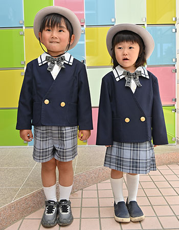 園児の笑顔が良く似合う、上品でかわいいブレザースタイルの冬服です。紺のブレザーにグレーベースのチェック柄が知的な印象を受けます。