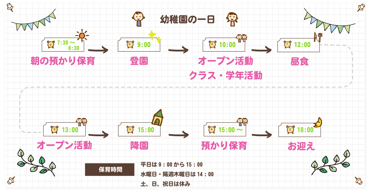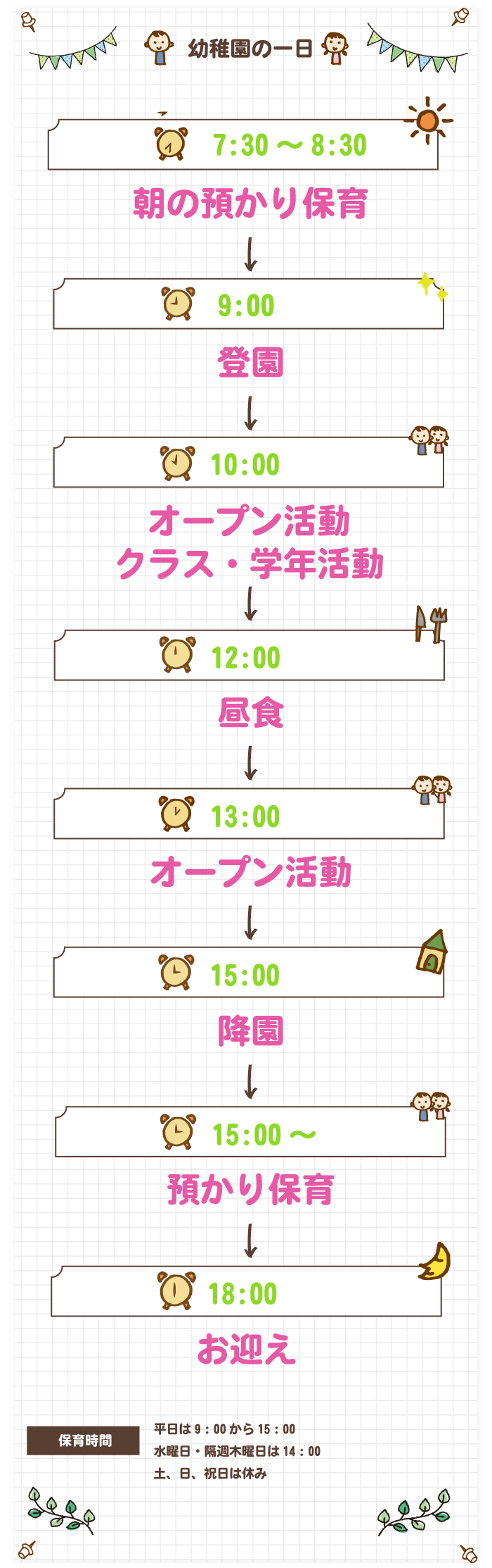 | 預かり保育 | 早朝7時30分から8時30分まで 保育後から18時まで 夏休み、冬休み、春休み期間中も預かり保育があります。 保育開始前は利用時間に関わらず1回300円 保育終了から2時間までは一律600円 2時間を超える場合は30分150円が加算されます。 また、保育の必要性があると認定を受けた場合には 利用実態に応じて最大月11,300円までの範囲で 預かり保育の利用料が無償化されます。 |